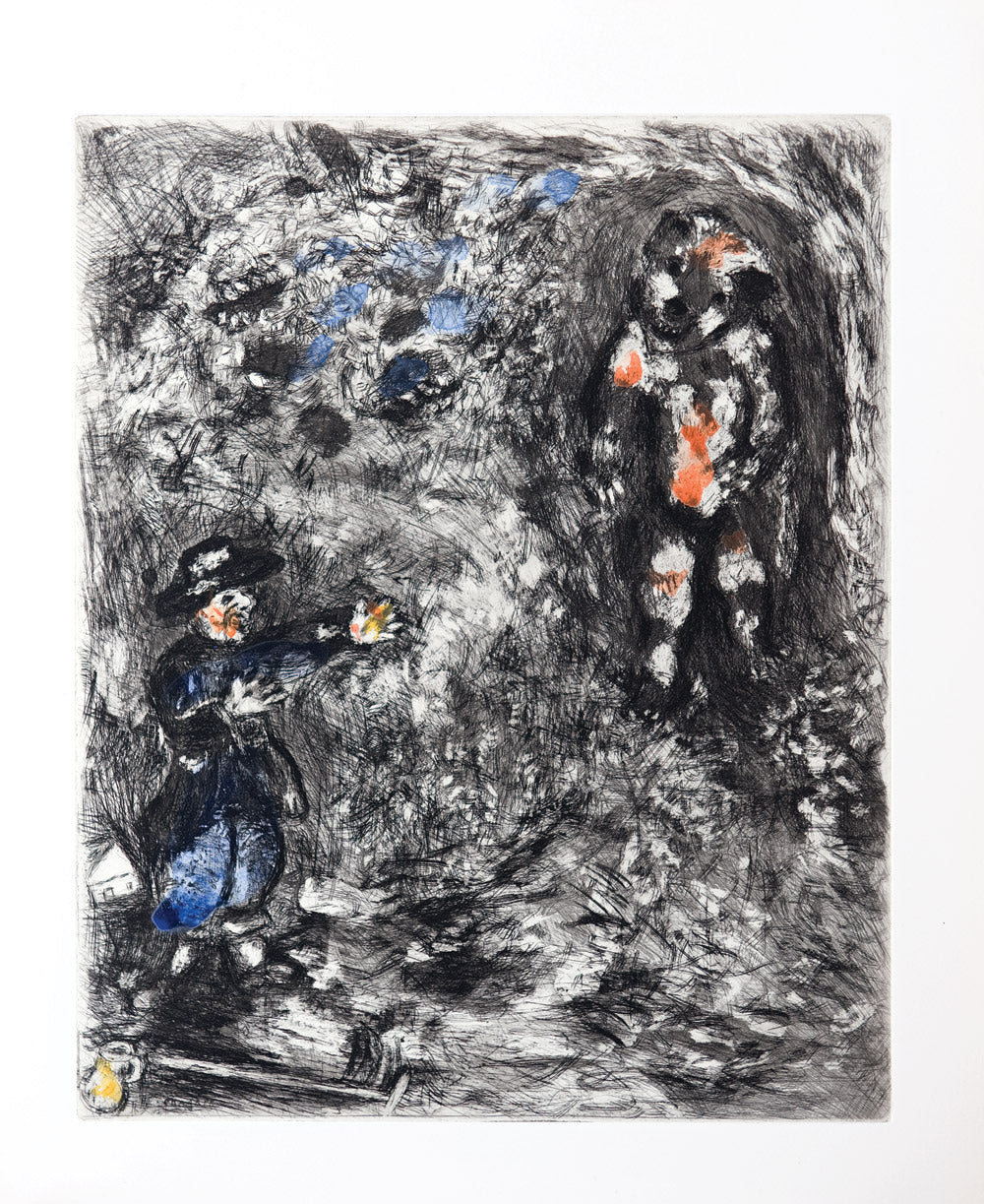 Returning to Paris in 1923 he met the art-dealer Vollard for whom he illustrated Gogol’s Dead Souls and the Fables of La Fontaine. Between 1941-47 he moved between occupied France and the USA, eventually settling near Nice. Chagall was a prolific artist, his work reminiscent of Jewish life, bible stories and of the folklore from his early years in Russia. He died in 1985.