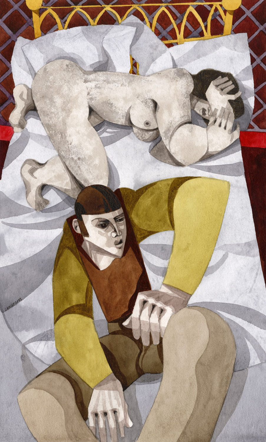 Human figures are important components in Large’s compositions, often men at work, and the work of Edward Burra and Stanley Spencer has been influential upon Large’s art. He has held several solo exhibitions and was commissioned to do a mural for Kings Cross Thameslink Station. In recent years he has lived and painted in Rutland and Malta.