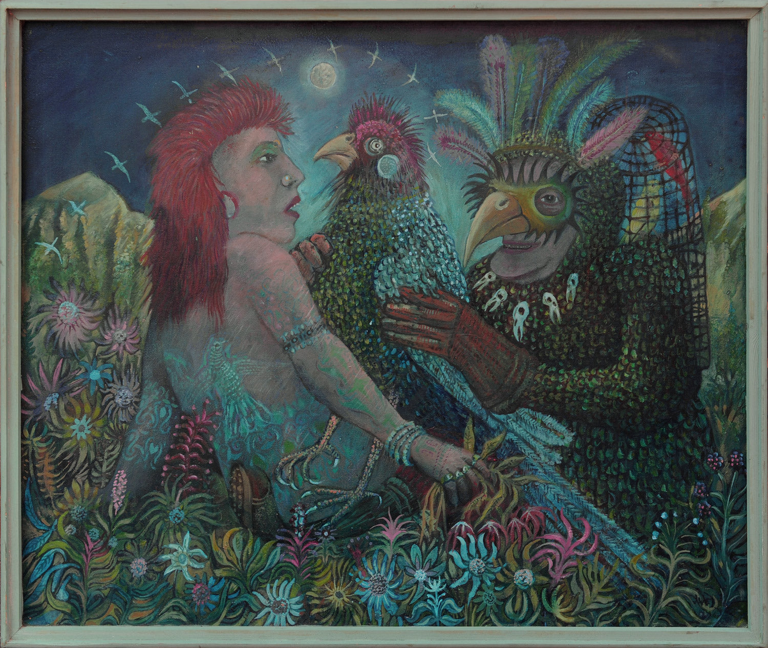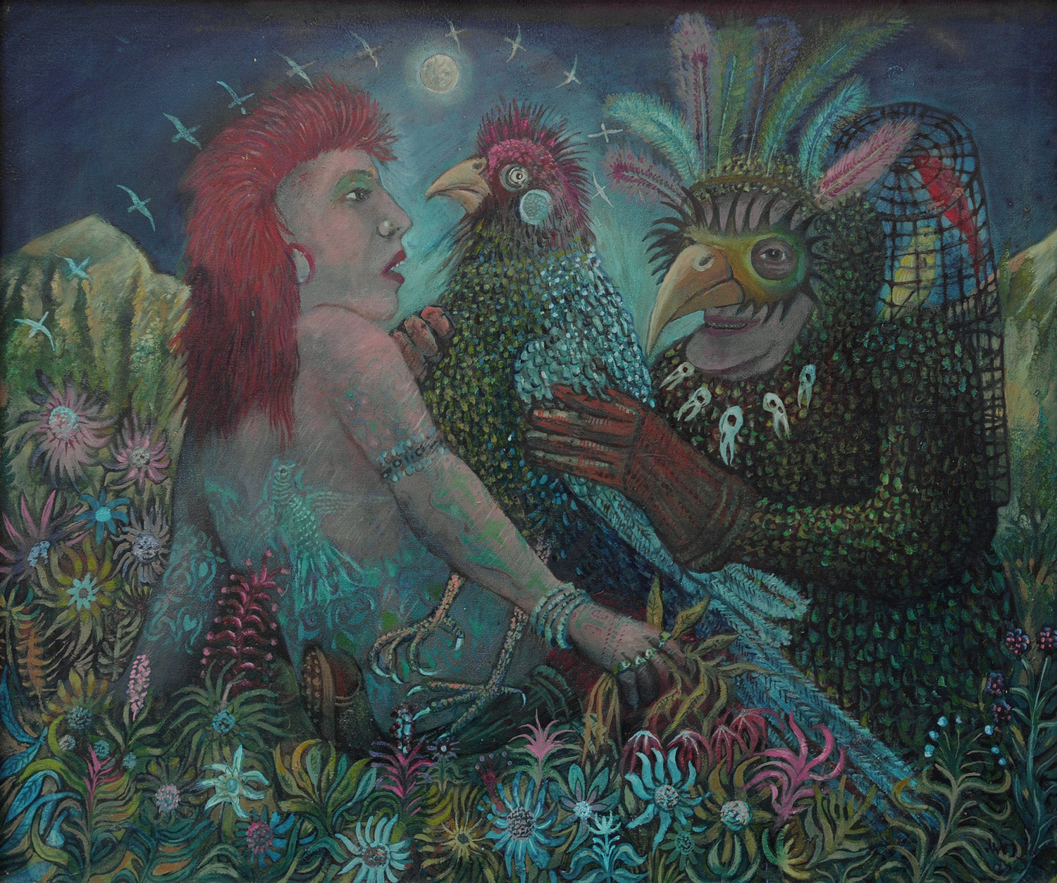 Farrington paints bird men, fairgrounds and circuses and has depicted the grimmer aspects of farming, having worked as a cowman. In 1984, he produced paintings for Granada Television’s The Ebony Tower, based on John Fowles’ novel. His painting process is all important, and involves the combination of form, colour and texture built up through the process of applying different glazed surfaces.