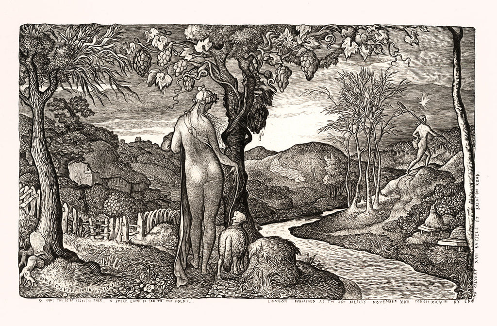 Calvert’s work after Blake’s death immediately matured, as if the loss of such an inspirational figure had spurred him on to greater heights. The period that followed from 1827 to 1831 is universally considered to have been Calvert’s pinnacle, comprising wood and copper engravings and lithographs all characterised by fine, dextrous lines depicting sylvan vistas - imagery redolent of both classical pastoral scenes and symbolic Christian parables.
