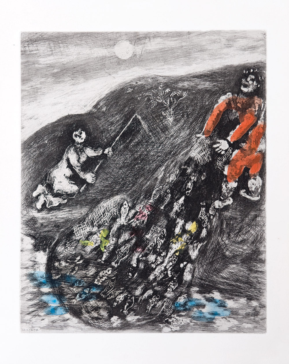 Chagall's etchings for La Fontaine's Fables were issued in 1952 in a numbered edition of just 200. This original etching is from one of just 85 sets of the suite which were handpainted by Chagall himself.