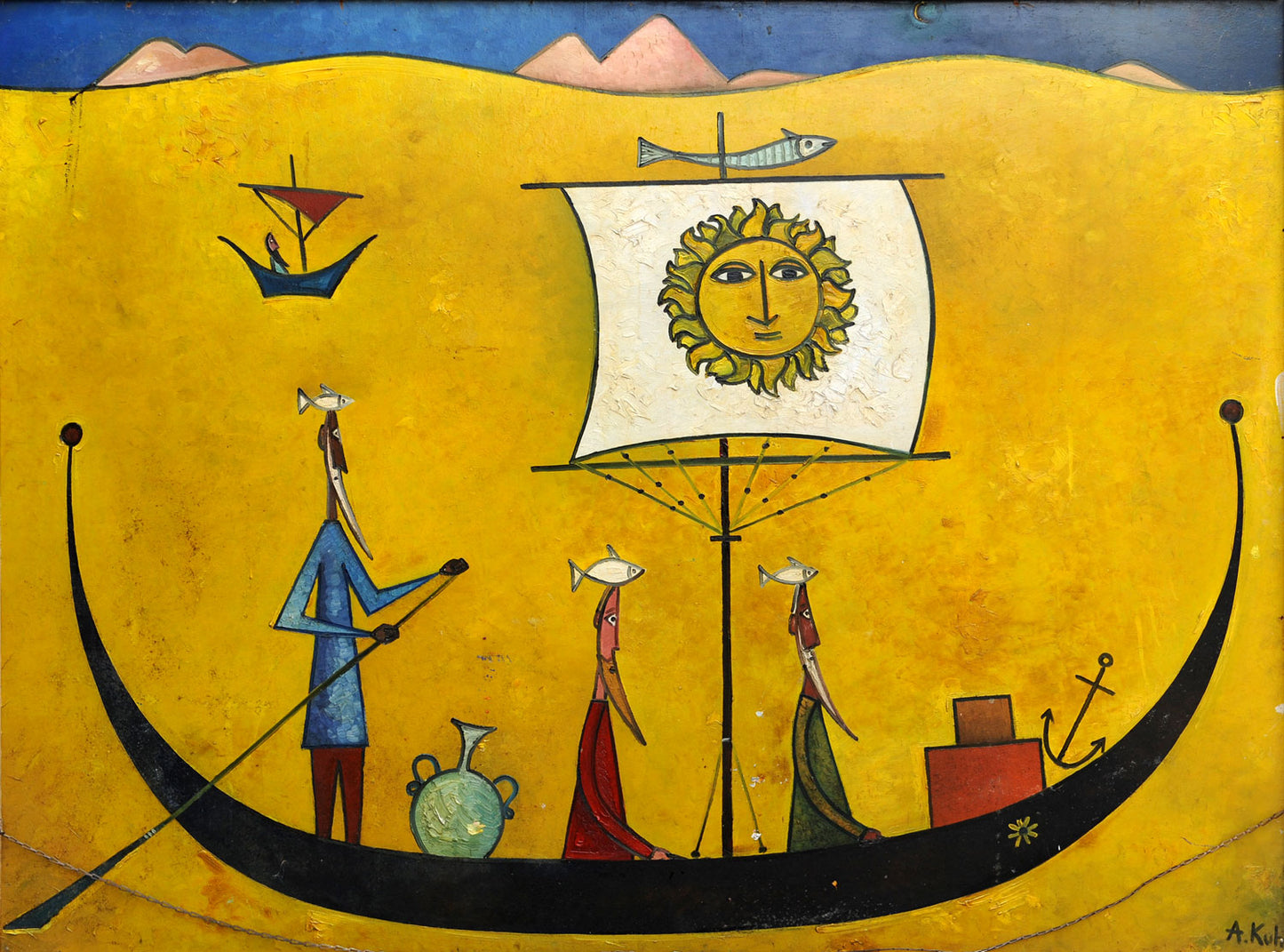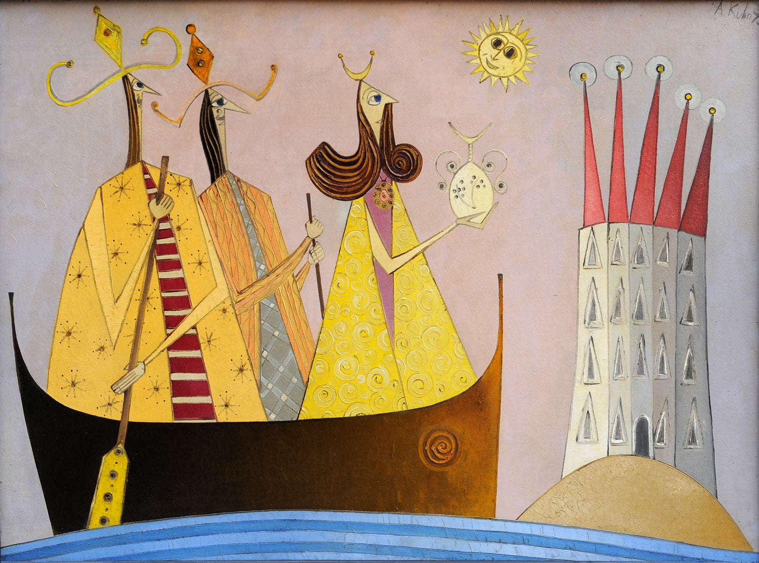 The Kuhn family spent several years in refugee camps in Iran, Palestine and Egypt and much of the subject matter and imagery of Kuhn’s paintings seems to originate from that period of his life. He arrived in England in 1947 and won a scholarship to the Chelsea School of Art at the age of twenty-four.