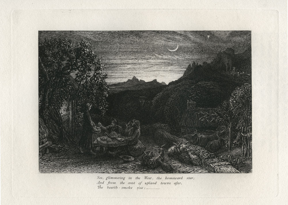Wording under image reads: See, glimmering in the West, the homeward star; And from the crest of upland towns afar, The hearth smoke rise.