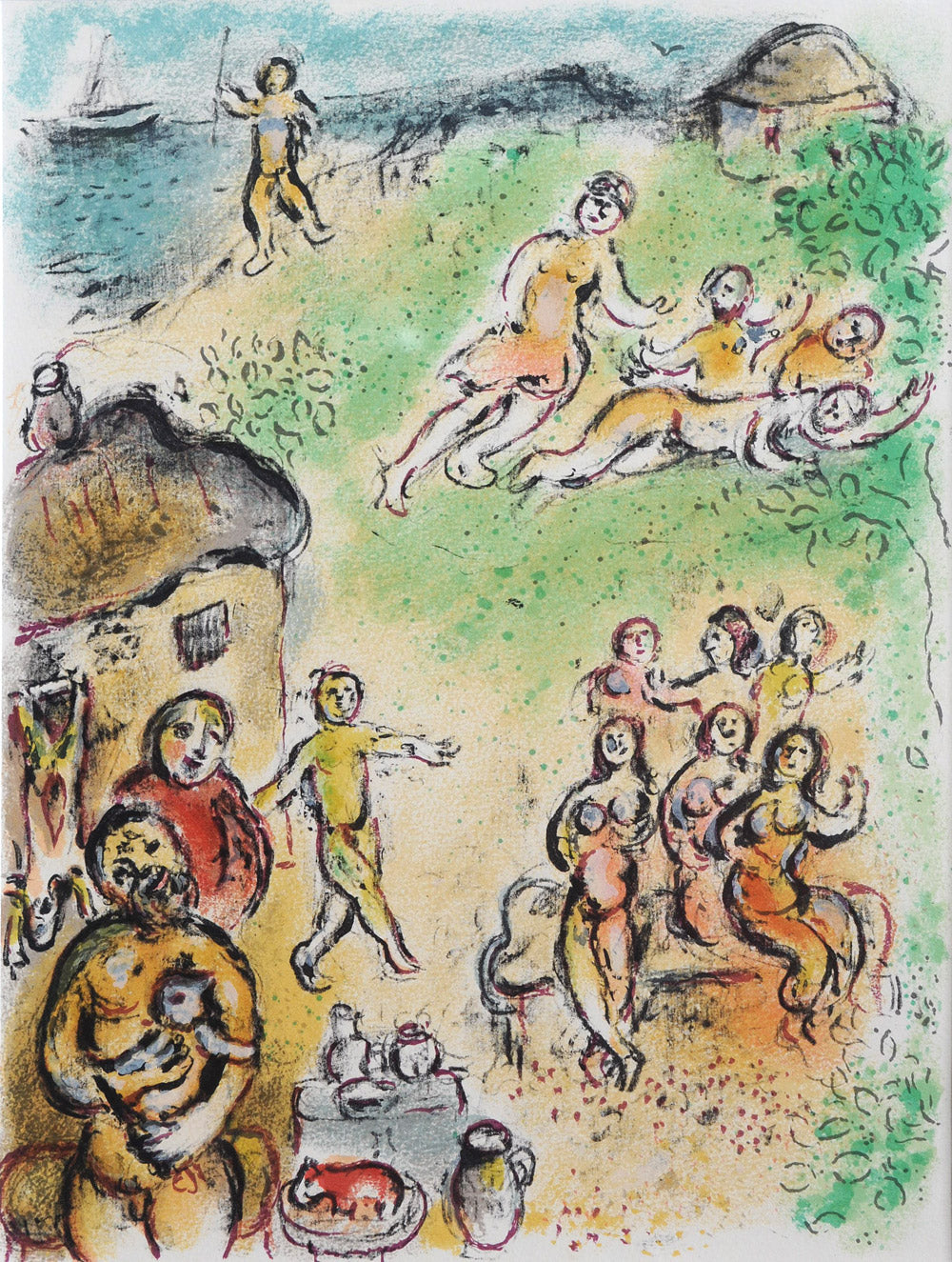 Returning to Paris in 1923 he met the art-dealer Vollard for whom he illustrated Gogol’s Dead Souls and the Fables of La Fontaine. Between 1941-47 he moved between occupied France and the USA, eventually settling near Nice. Chagall was a prolific artist, his work reminiscent of Jewish life, bible stories and of the folklore from his early years in Russia. He died in 1985.