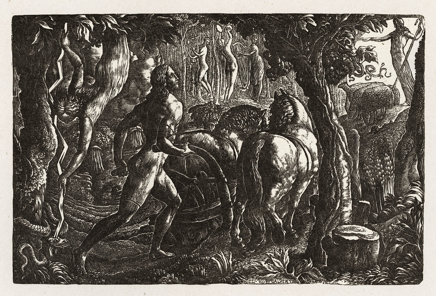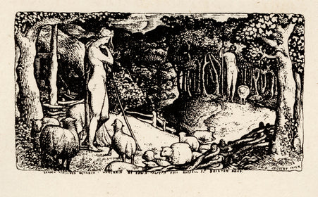 Calvert’s work after Blake’s death immediately matured, as if the loss of such an inspirational figure had spurred him on to greater heights. The period that followed from 1827 to 1831 is universally considered to have been Calvert’s pinnacle, comprising wood and copper engravings and lithographs all characterised by fine, dextrous lines depicting sylvan vistas - imagery redolent of both classical pastoral scenes and symbolic Christian parables.