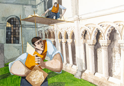 Human figures are important components in Large’s compositions, often men at work, and the work of Edward Burra and Stanley Spencer has been influential upon Large’s art. He has held several solo exhibitions and was commissioned to do a mural for Kings Cross Thameslink Station. In recent years he has lived and painted in Rutland and Malta.