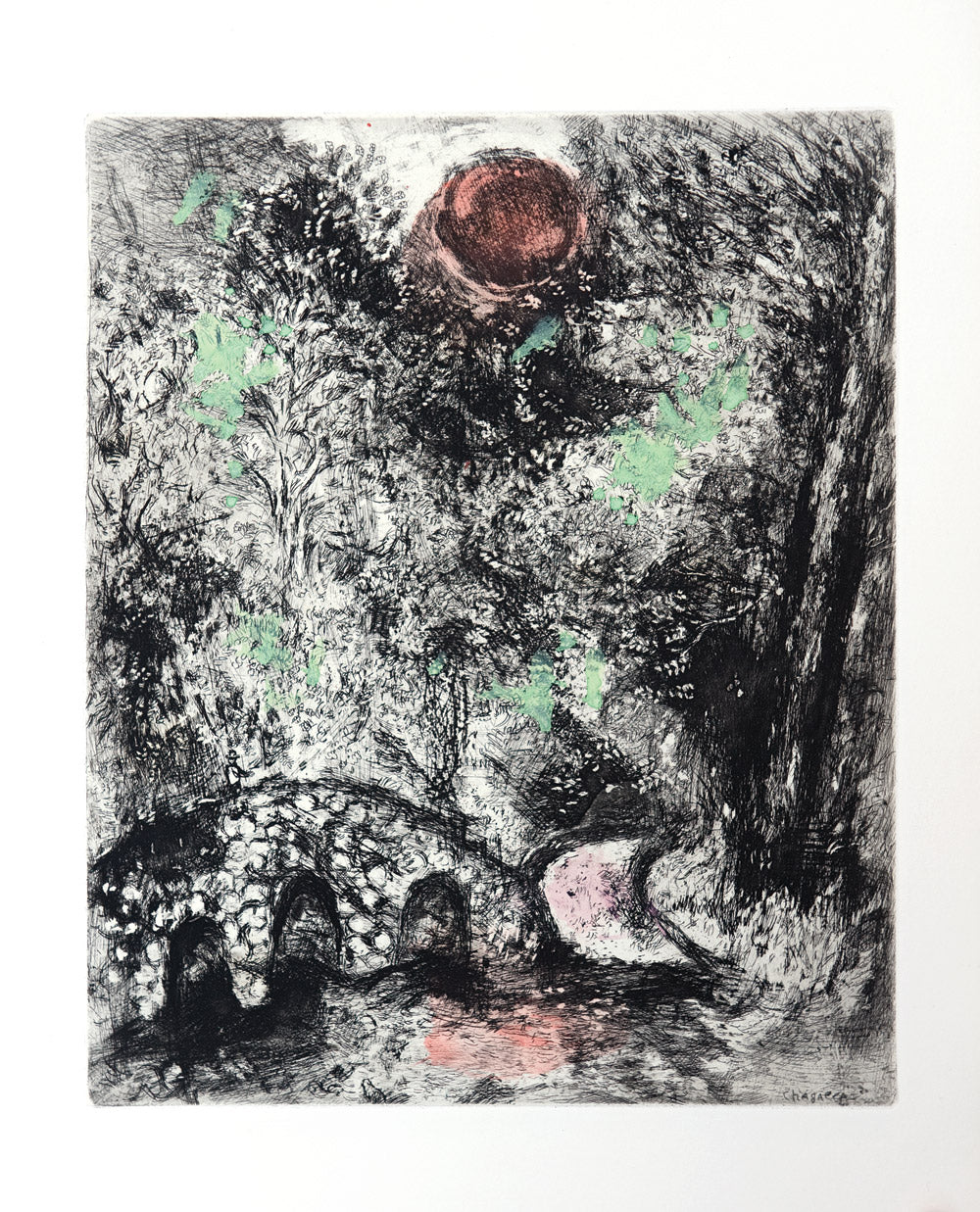 Chagall's etchings for La Fontaine's Fables were issued in 1952 in a numbered edition of just 200. This original etching is from one of just 85 sets of the suite which were handpainted by Chagall himself.