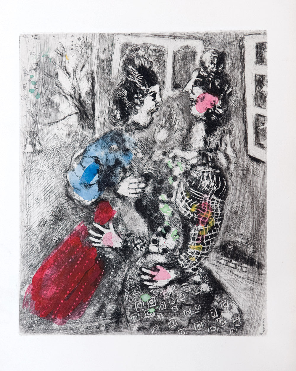 Chagall's etchings for La Fontaine's Fables were issued in 1952 in a numbered edition of just 200. This original etching is from one of just 85 sets of the suite which were handpainted by Chagall himself.