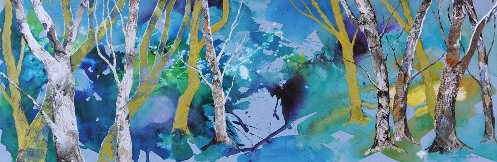 Jenny Grevatte is continually evolving and developing her ideas and methods. Recent themes include trees and woods, hedges, rooftops, huts , bookshelves, rock formations, sunflowers, artichokes, wild flowers and, her constant favourite, still life. Scale, format and composition are exciting challenges for her and recently she has been exploring the quality and mystery of changes of light in the landscape. A new and powerful theme is the moon, seen in all its varying moods and allowing Jenny to introduce a new palette of dark colours.