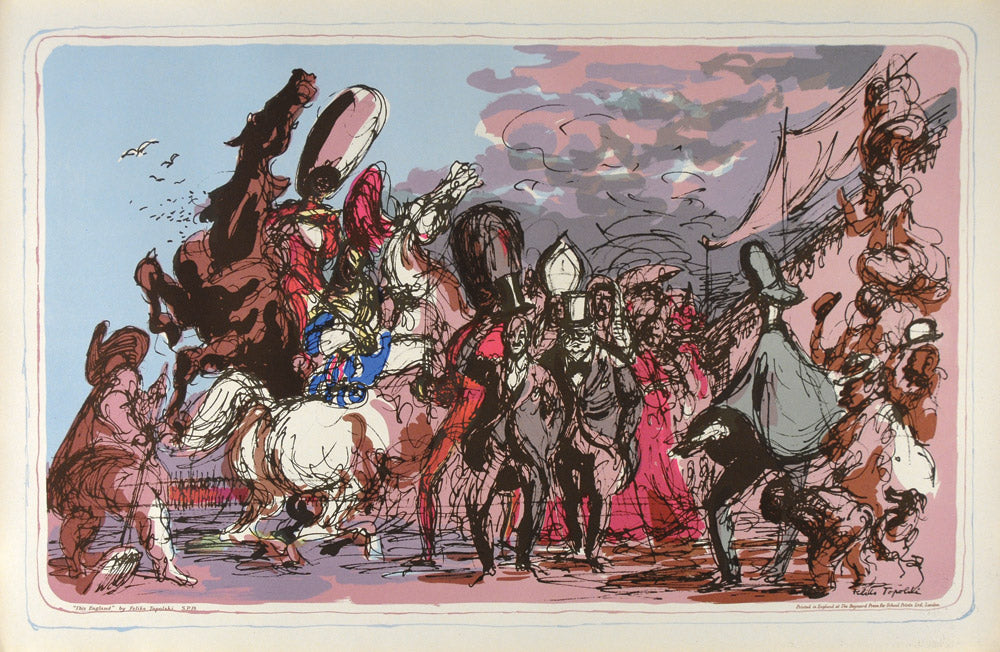 Topolski studied at the Warsaw Academy of Fine Art (1927-32). He came to London in 1935 and was naturalised in 1947. He had worked as a political cartoonist in Poland and came to the fore in Britain for his reportage. He recorded the Blitz, published many sketchbooks and did murals, designs for the theatre and countless illustrations for magazines and newspapers. His flamboyant and sketchy This England, depicting an English crowd and parade with Churchill in the centre, although colourfully symbolic and with a swaggering energy, might have meant little to young children.