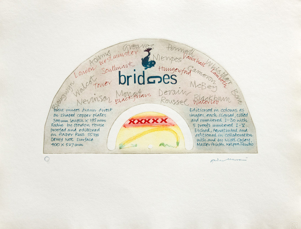 "My own Bridge portfolio of etchings suggest a modest homage to an old friend and to those previous artists of a different time. The river's turn from Westminster, Big Ben to Blackfriars and St Paul's, on to Southwark, passing Whitehall Court (twin black towers) on the north side. It was here from Sidney Nolan's balcony apartment high at the centre of the building that we both marvelled on many delightful occasions at the river's twisted flow, a view embracing several bridges from East to West, a majestic sight to behold in any weather at any time of day or month." - Gordon House, Gordon House Editions 1982 - 1996.