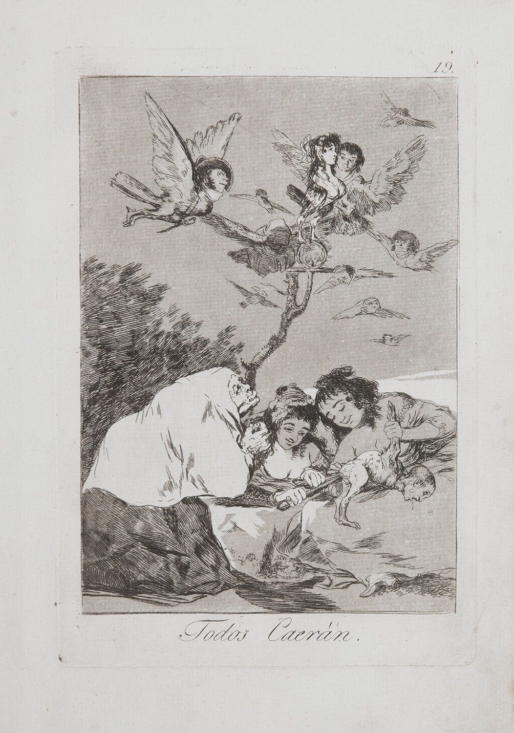 Now almost deaf, Goya’s work showed greater elements of fantasy and satirical observation. Completed in 1799, the Caprichos etchings analysed humanity’s flaws and provided the stylistic basis for his greatest and darkest work, The Disasters of War, composed during the Peninsular War. Goya later returned to Spain, but soon went into voluntary exile in Bordeaux, working until his death there in 1828.