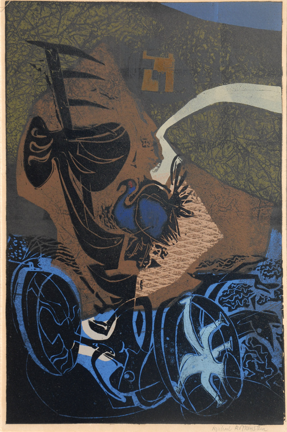 Rothenstein became one of the most experimental printmakers in Britain during the ‘50s and ’60s. As well as found objects such as wood offcuts and metal debris, he incorporated fresh 20th century imagery into his relief prints, combining photographic material with traditional woodcuts and linocuts. Numerous major galleries currently hold his work and he was made Hon. RE and elected RA in 1983.