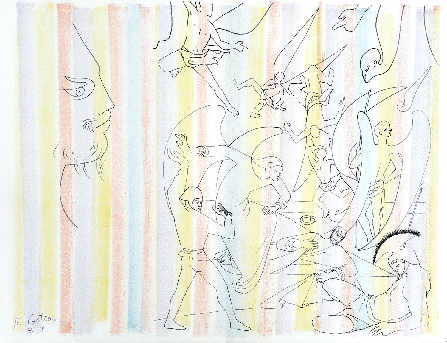 However, it was not until his later life that Cocteau added art to his catalogue of theatrical productions, films and writing, experimenting in pastels, prints and posters and eventually taking up easel painting in 1950. Cocteau loved the spectacle of bull-fights, often watching shows alongside Picasso, and the Taureaux set of lithographs they inspired was published in 1965, two years after his death.