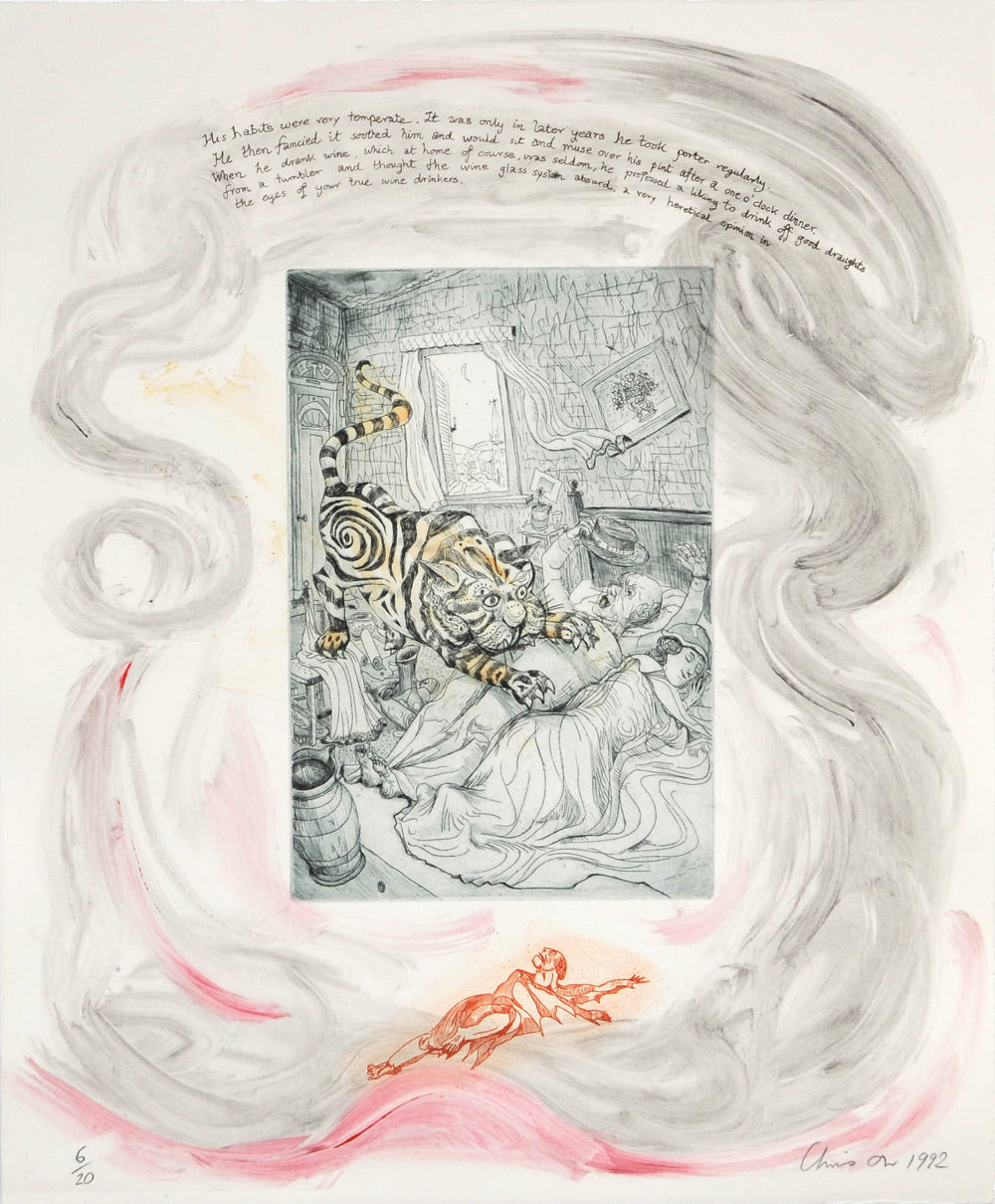 Drawn and etched by Chris Orr Amonite Studio 1992 printed on Saunders Waterford 350gm.paper monoprint intaglio and counterproof-intaglio. Text derived from contemporary sources in the Blake records
