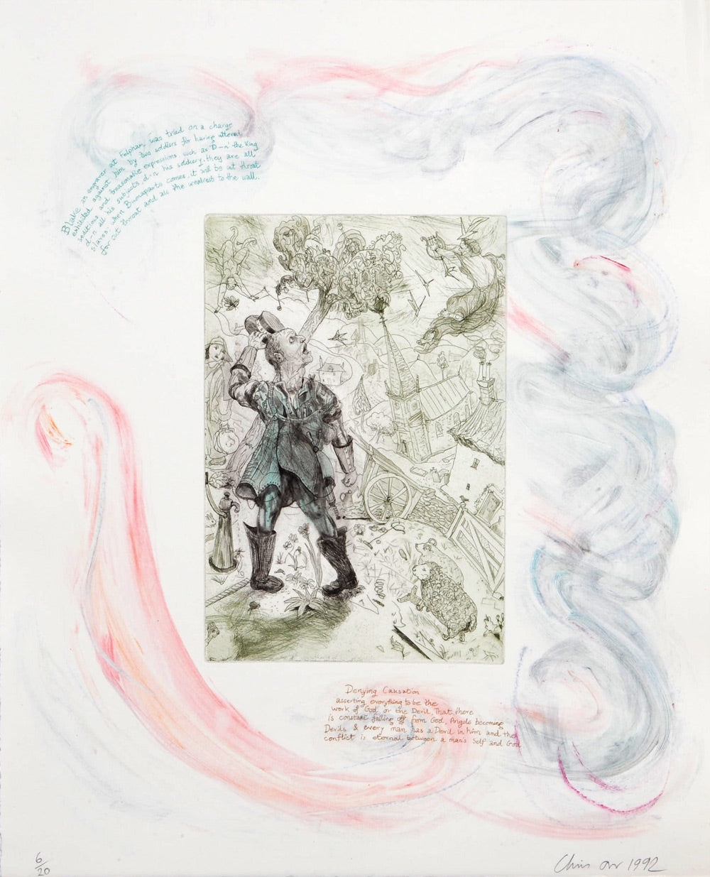 Drawn and etched by Chris Orr Amonite Studio 1992 printed on Saunders Waterford 350gm.paper monoprint intaglio and counterproof-intaglio. Text derived from contemporary sources in the Blake records