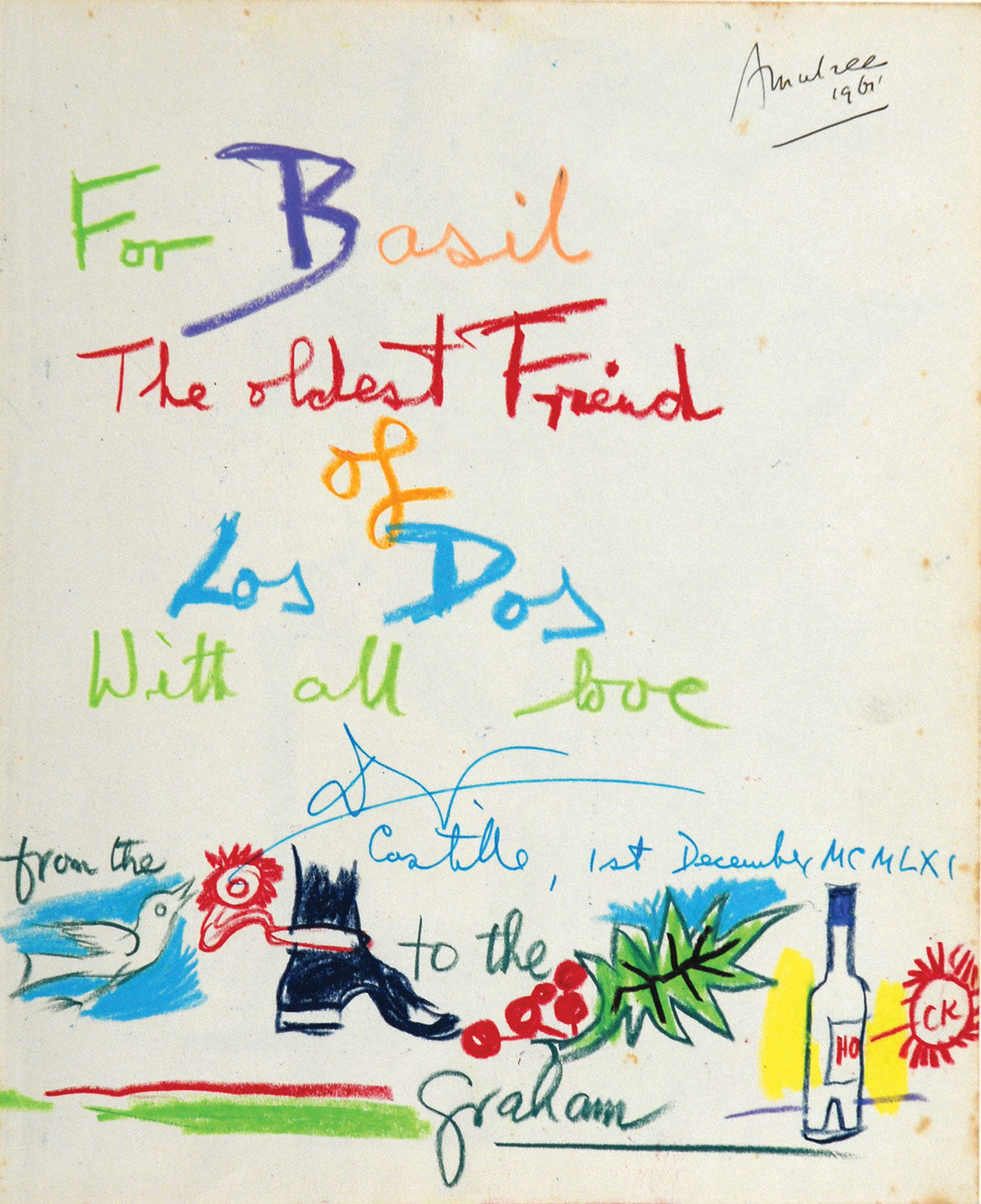 For Basil, The oldest freind of Los Dos with all love from the (dove, spurs to the holly hock) Graham.