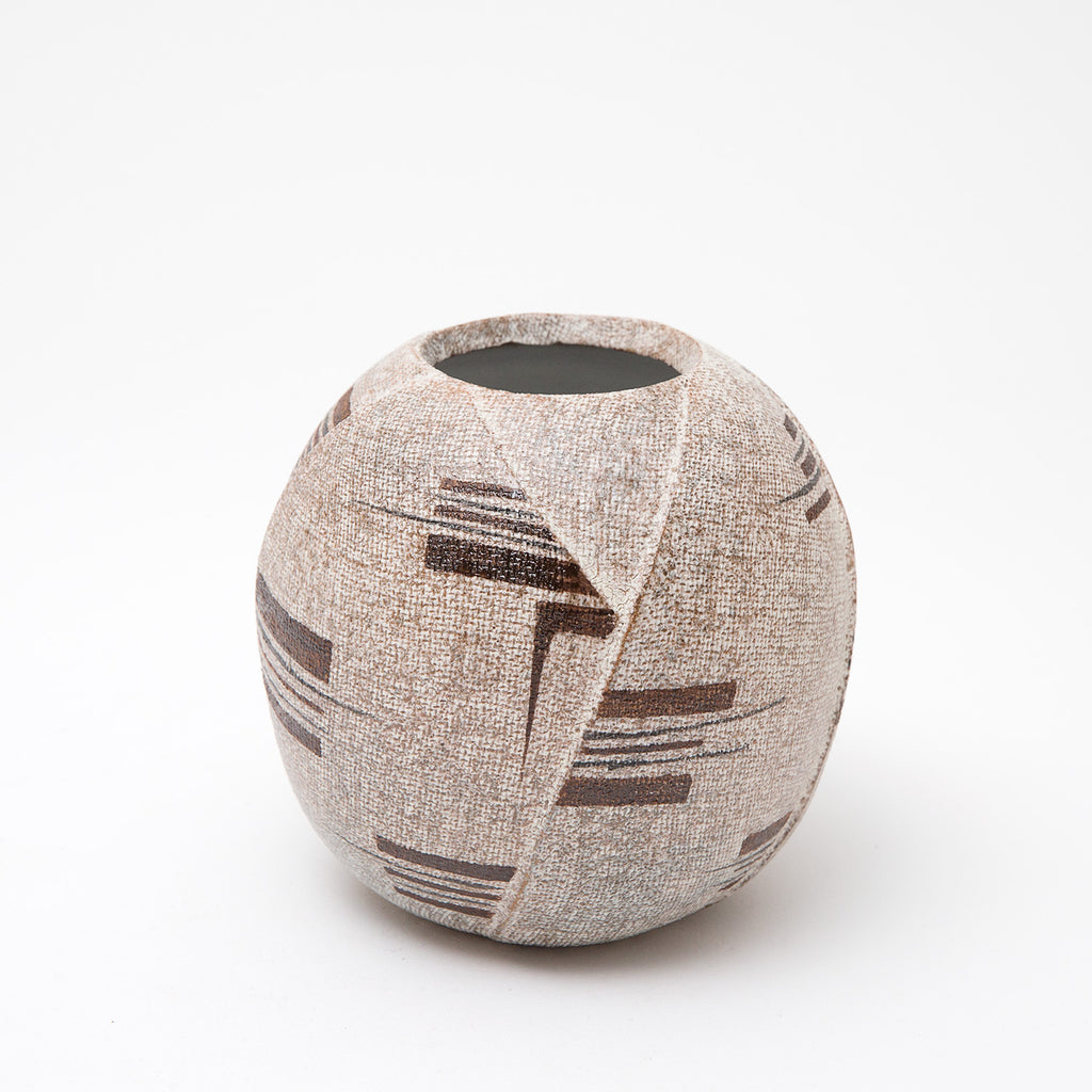 Aboriginal arrowheads straight out of Australia dance across Toshihiko Takeda’s hand-painted cups and vases, their surfaces textured like hessian cloth.