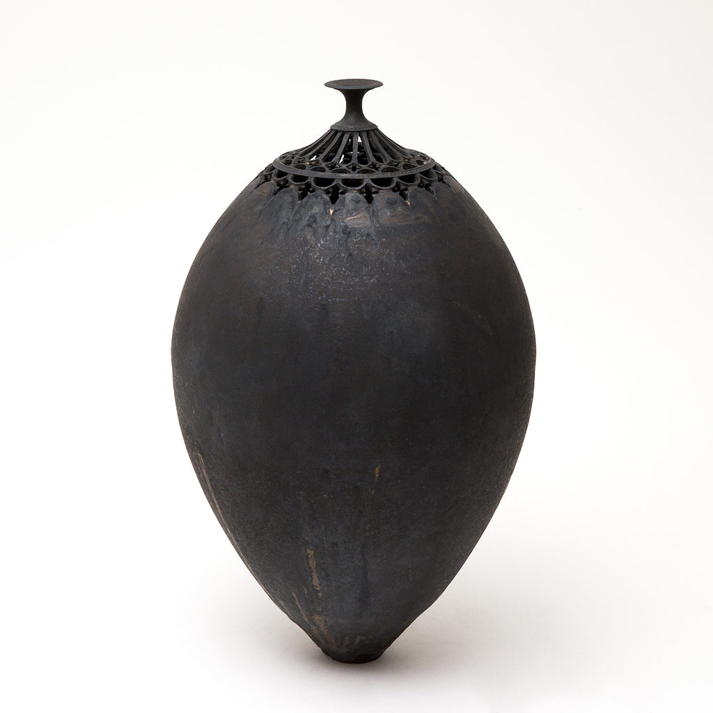 With smoky, metallic glazes he captures the ornate opulence of Persian and Moorish silverware, tempering their extravagance with a minimalism of black and white surfaces.