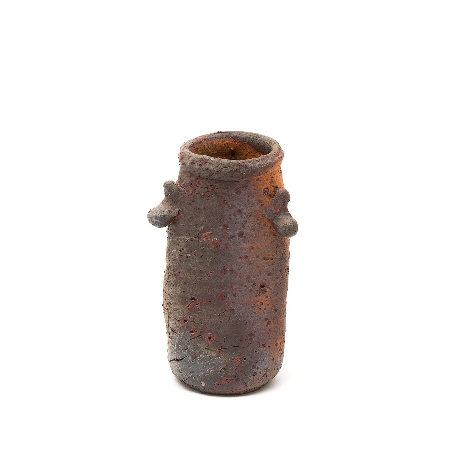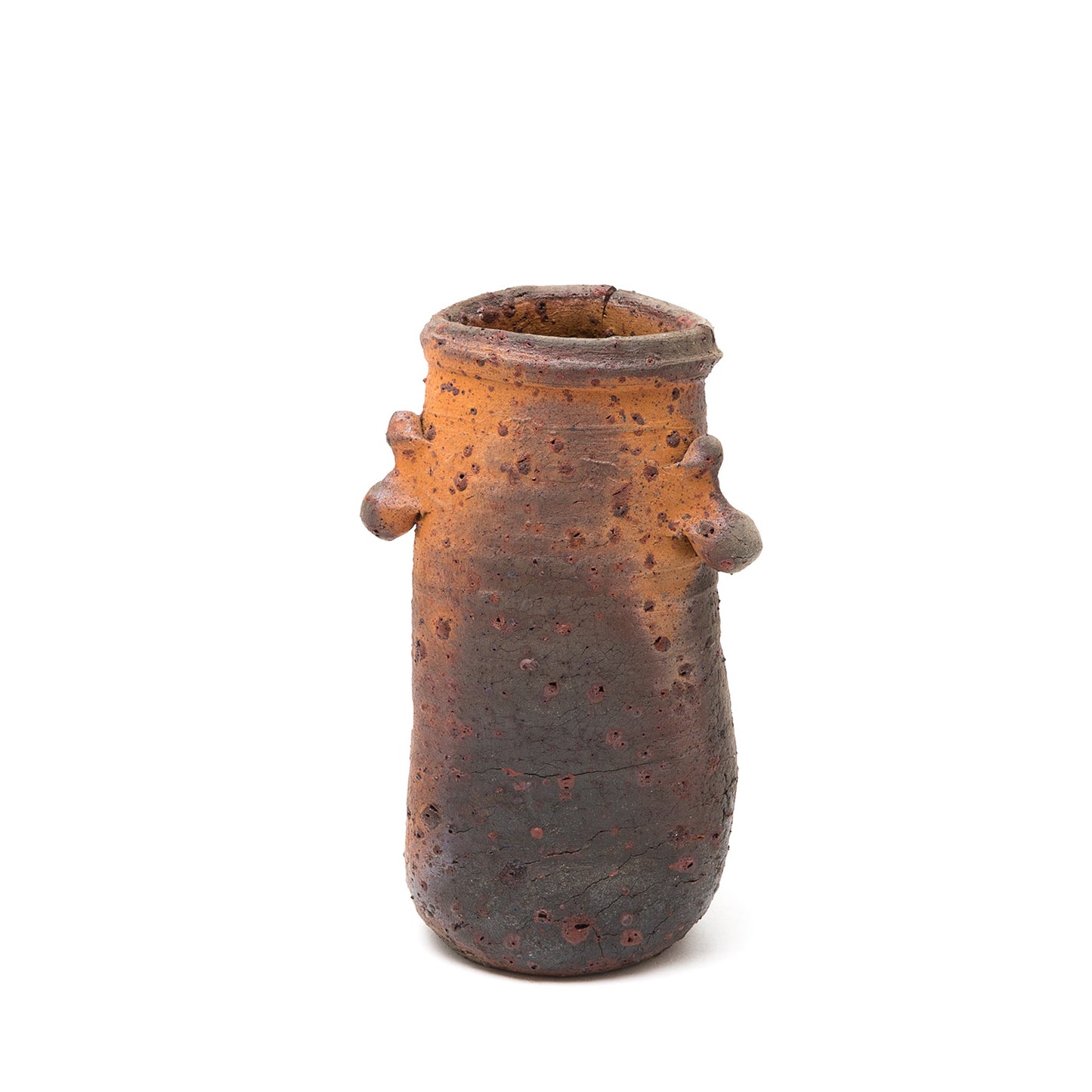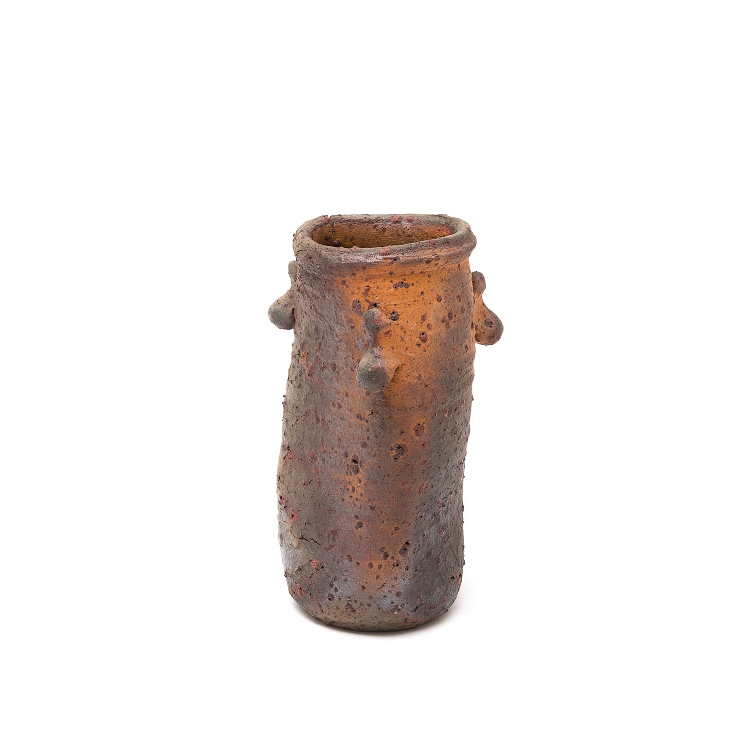 His square-lipped pouring bowls are refined with a touch that belies the coarseness of his clay, while blushing wood-fired porcelain bottles shimmer with pink and purple pearlescence.