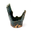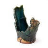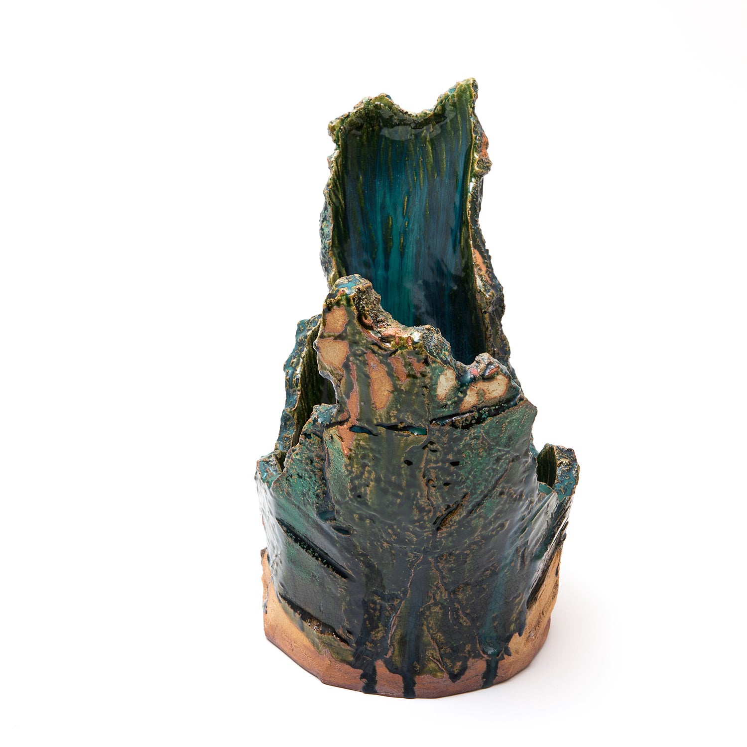 Her sake ‘monsters’ combine Jurassic dinosaur bodies with dainty beaks and curled up feet, while her jungle-green Oribe, cresting and pooling into opaque aquamarine blue, is a thing of prehistoric beauty.