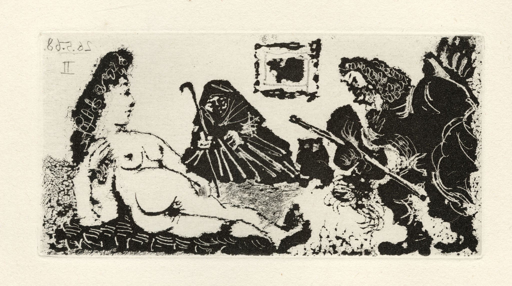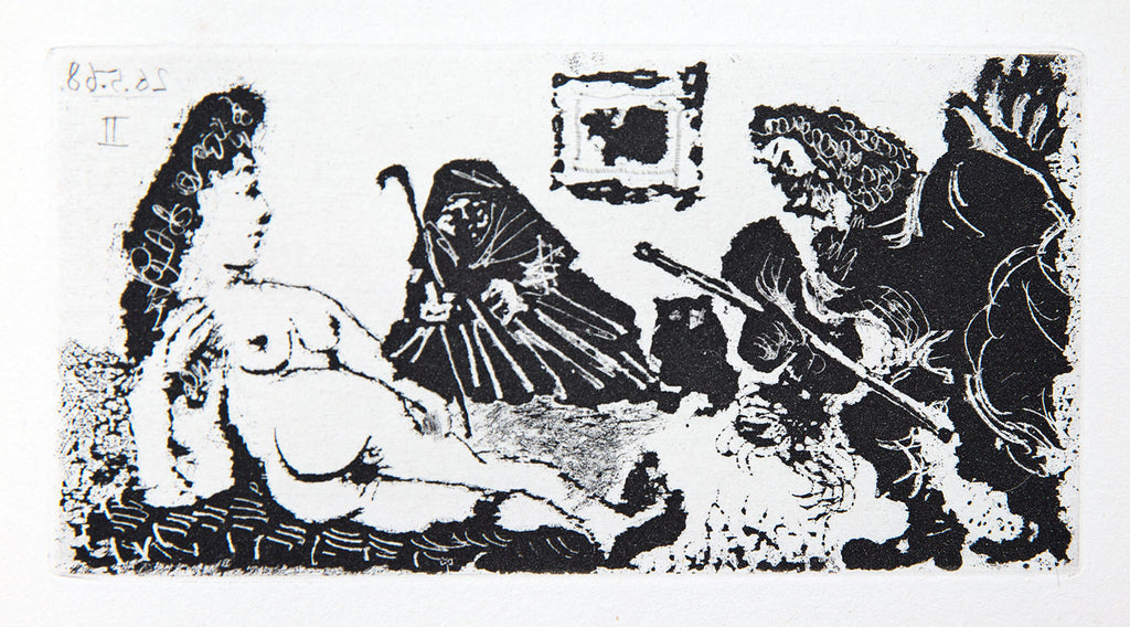 Between March 16 and October 5, 1968, Picasso worked on the plates almost daily, using various techniques (sometimes on the same plate); he was impatient to see the impression as soon as it was pulled by Aldo and Piero Crommelynck, who had installed their atelier at Mougins.