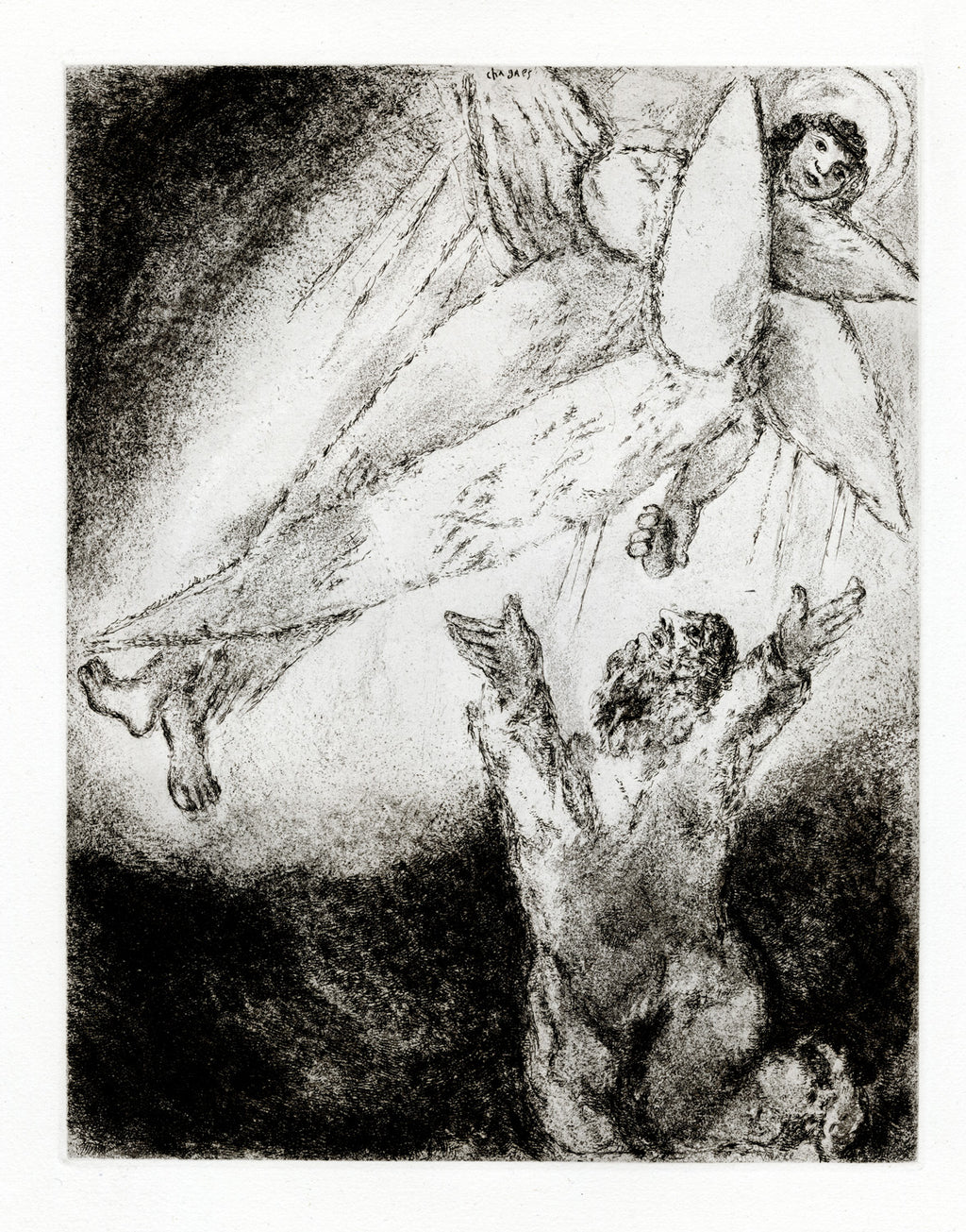 It would not be taken up again until 1952, when Chagall returned to the 39 unfinished plates. By 1956 the suite was complete, and a new publisher was found in Tériade. The final 105 etchings, characterised by an exquisite interweaving of lines hatched, scratched, and scored, are thought to be Chagall’s greatest and most personal work as a printmaker. ‘If we had nothing of Chagall but his bible,’ wrote Meyer Schapiro, writer and close friend, ‘he would be for us a great modern artist.’