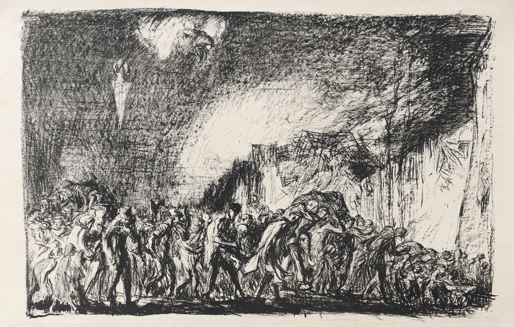 Depicting refugees leaving a town destroyed during the war, with a swarm of people processing right. An eagle's head rises through the dark sky and the shape of the sword of Damocles points down at the struggling masses.