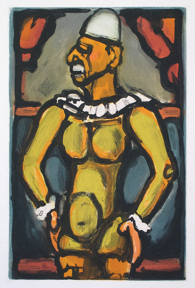 During the decade before the Great War, Rouault developed themes in his art including depictions of the circus, prostitutes, law courts and religion. In 1913 the renowned art dealer Vollard purchased all of Rouault’s artistic output and four years later became his sole agent, setting him up in a studio and offering commissions. In the inter war period Rouault was best known for his popular prints. He died in 1958.