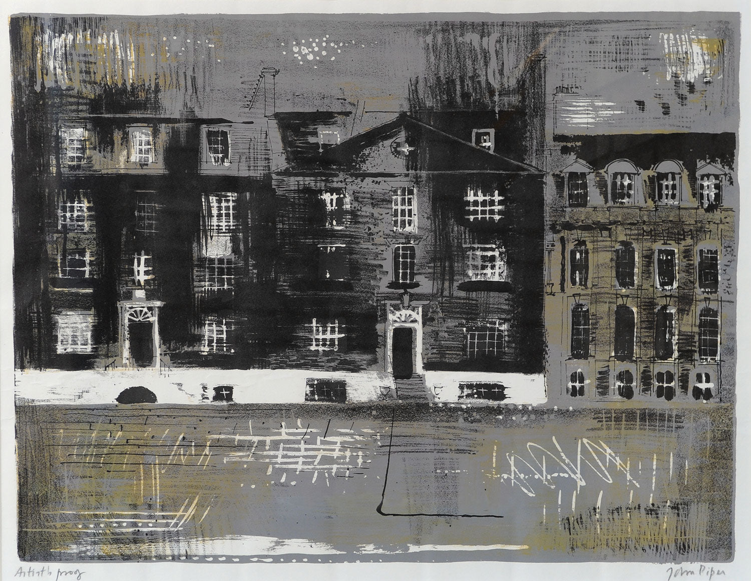 In the Tate Collection - This lithograph is one of two commissioned by Westminster School. Piper did not make many paintings or drawings of places in London, except when specifically commissioned. He had not lived there since soon after giving up his first career as a lawyer, and he preferred to work in isolated places where he could not be overlooked. Typically, there are no people in this view, which looks as if it were seen at night.
