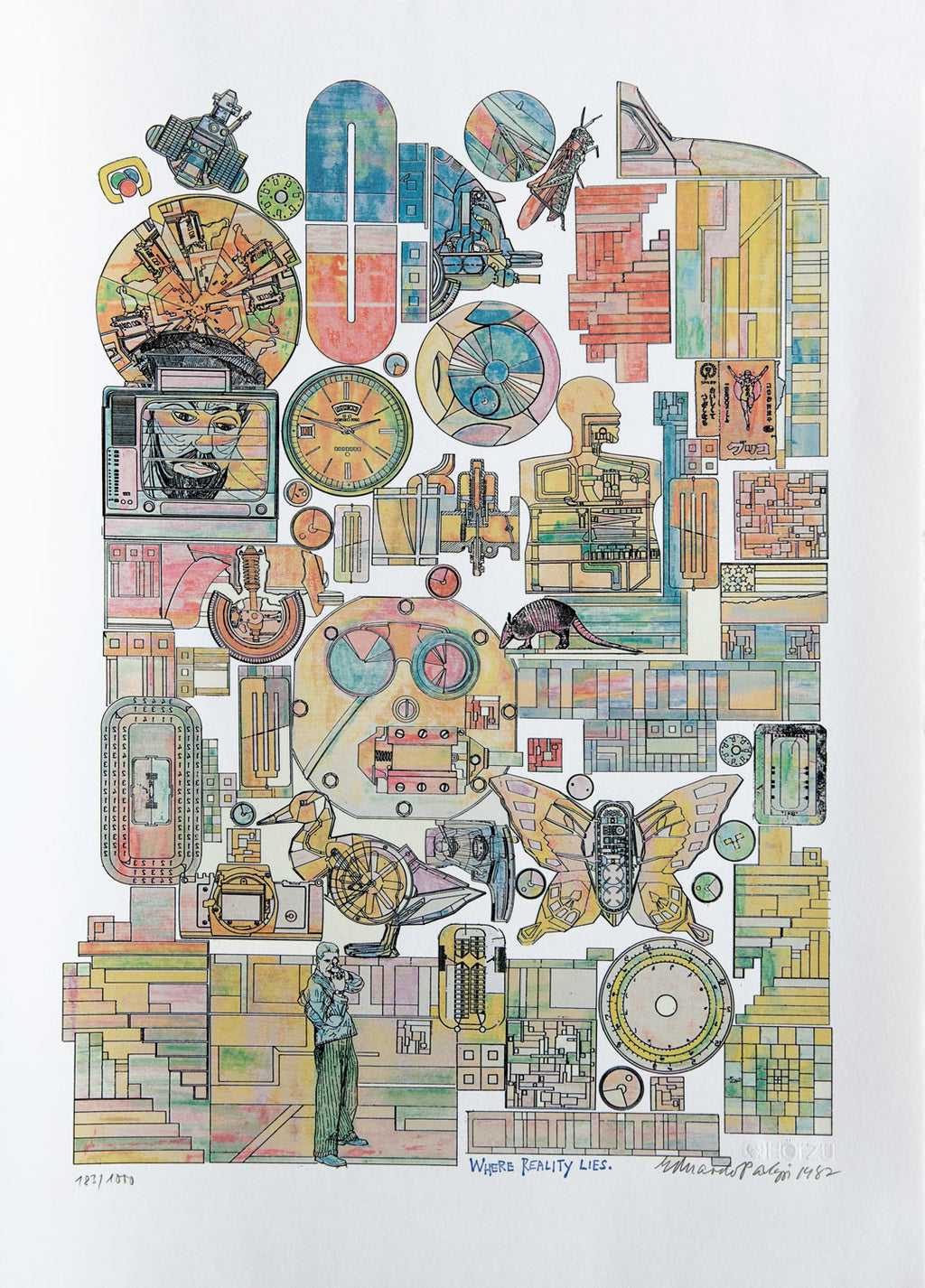 A significant member of the Group, Paolozzi greatly influenced the development of Pop Art. He emerged fully onto the Pop Art scene in 1962 with his abstract, robot-like figures such as Four Towers and Solo, but of all his work his screenprints are said to have had the largest impact on Pop Art. He taught all over the world as guest professor and lecturer, and was knighted in 1988. Eduardo Paolozzi died in 2005.