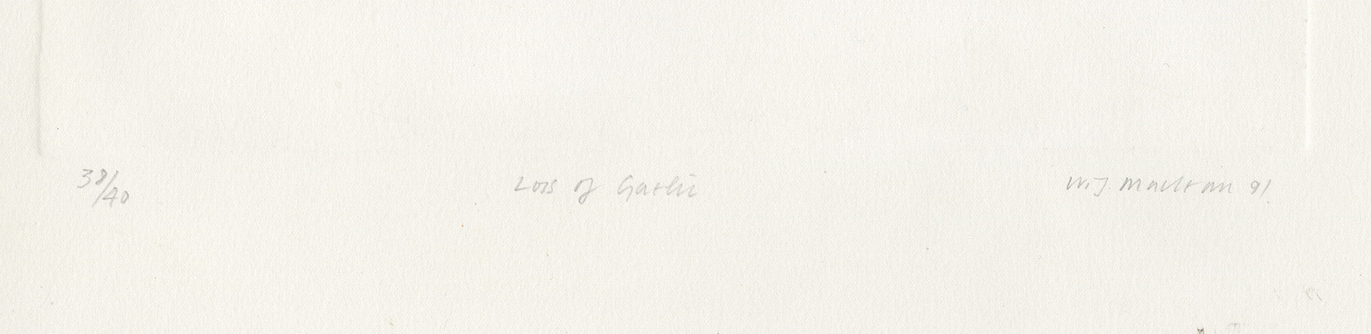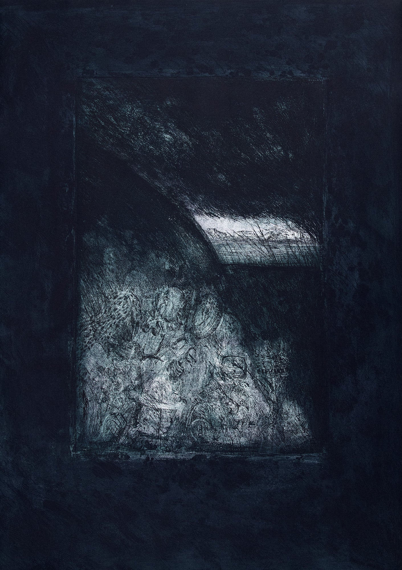 ‘Sioldadh no Gaidhlige’, a poem by Meg Bateman, was the inspiration for this etching. The poem deals with the decline of the language and culture of the Gael with the imagery of a fraying anchor rope. Will Maclean’s dark mournful etching, with half-present figures and obscured symbols conveys this dreadful loss. However, there is a glimmer of hope on the horizon as a shaft of light illuminates the Highland landscape.
