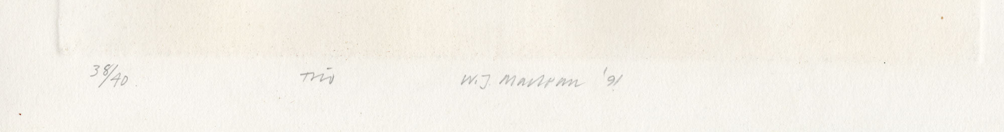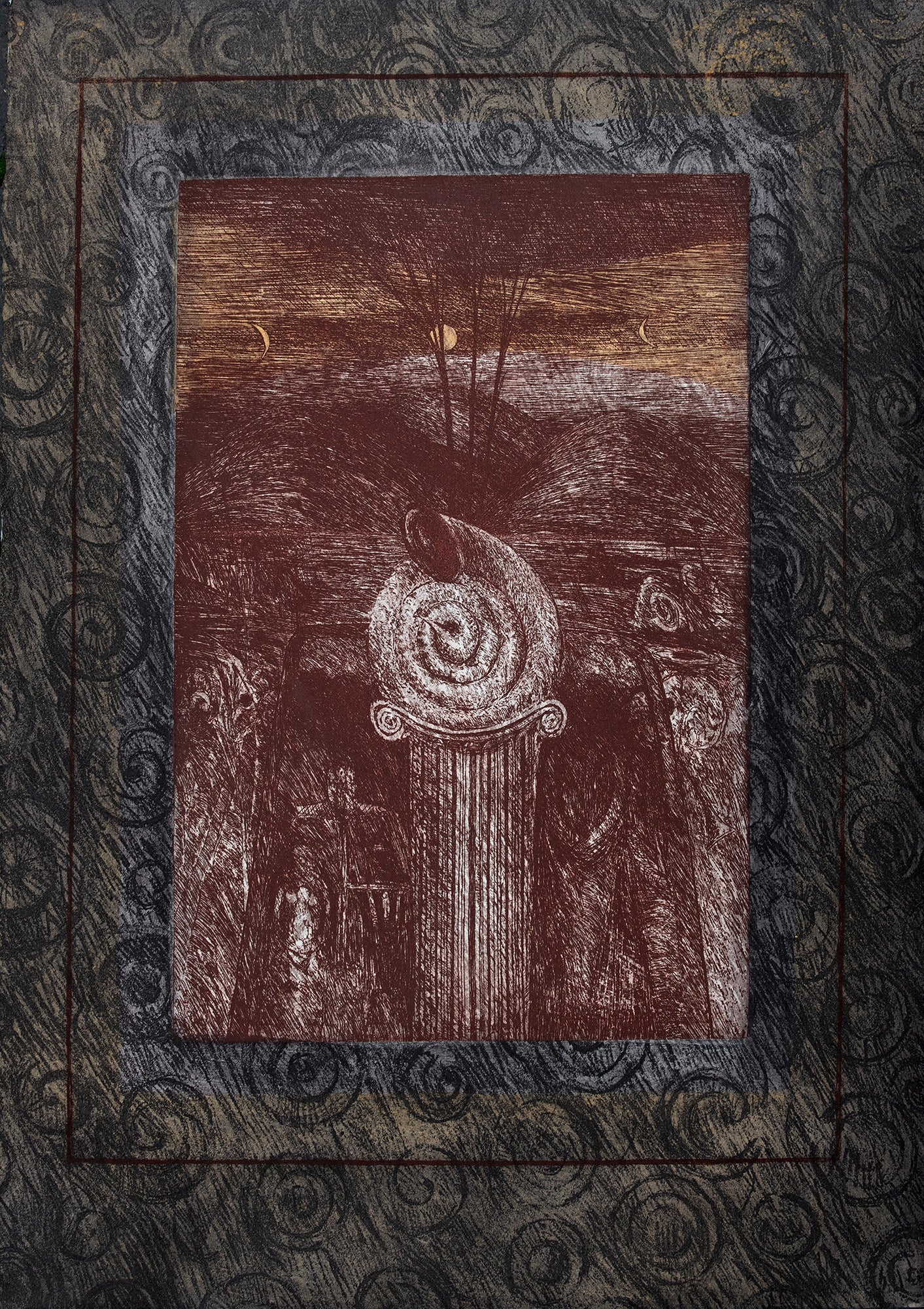 The number three holds magical or mystical associations in many cultures and this is explored in the poem by Edinburgh based contemporary poet, Valerie Gillies. The poem tells of the continuum of the cycle of life and in the etching this is made visual with the never-ending phases of the moon and the spiral shell presented on an altar-like plinth. The image has a spiritual quality to it, reflecting on the mystery of the unknown forces of nature.