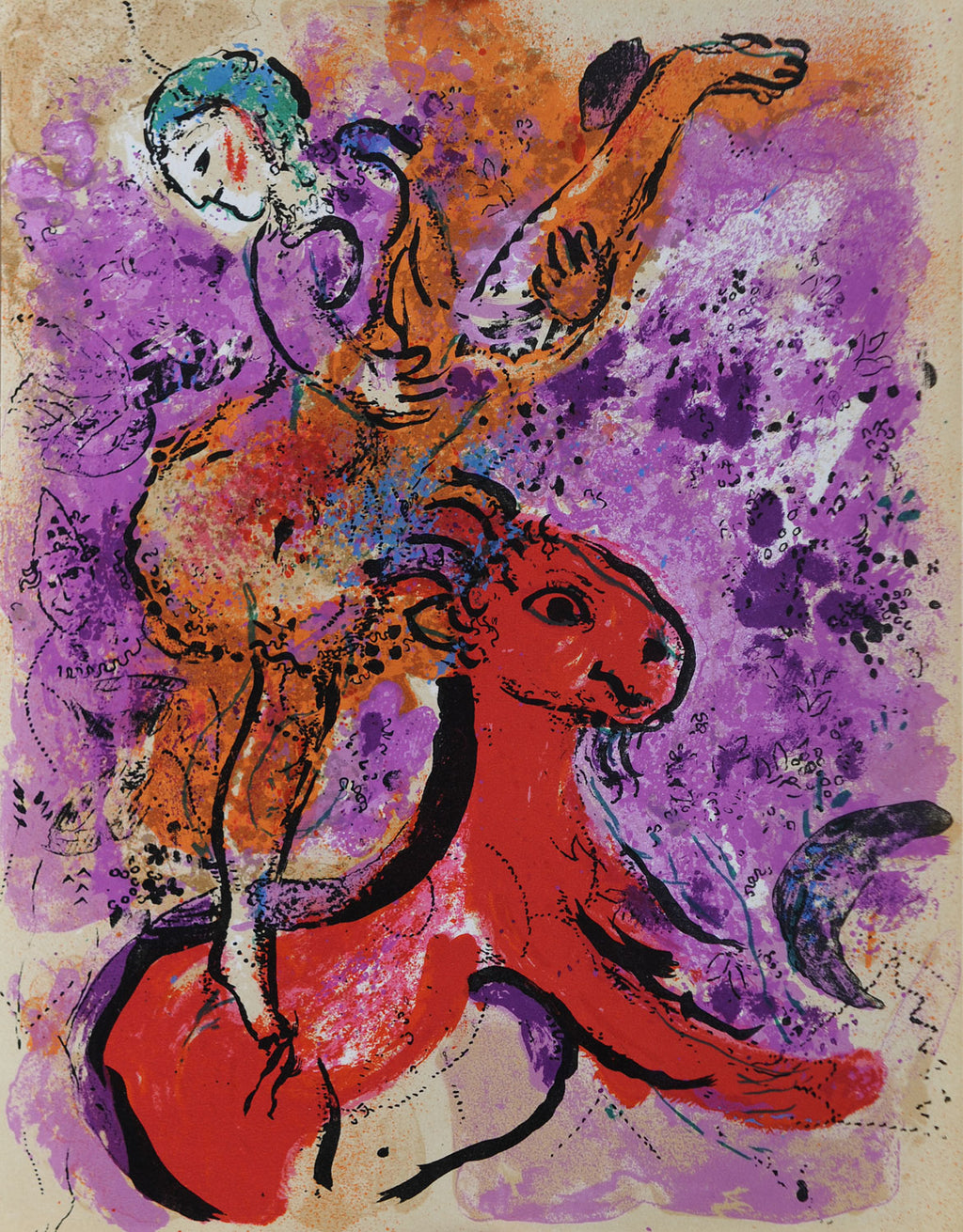 Returning to Paris in 1923 he met the art-dealer Vollard for whom he illustrated Gogol’s Dead Souls and the Fables of La Fontaine. Between 1941-47 he moved between occupied France and the USA, eventually settling near Nice. Chagall was a prolific artist, his work reminiscent of Jewish life, bible stories and of the folklore from his early years in Russia. He died in 1985.
