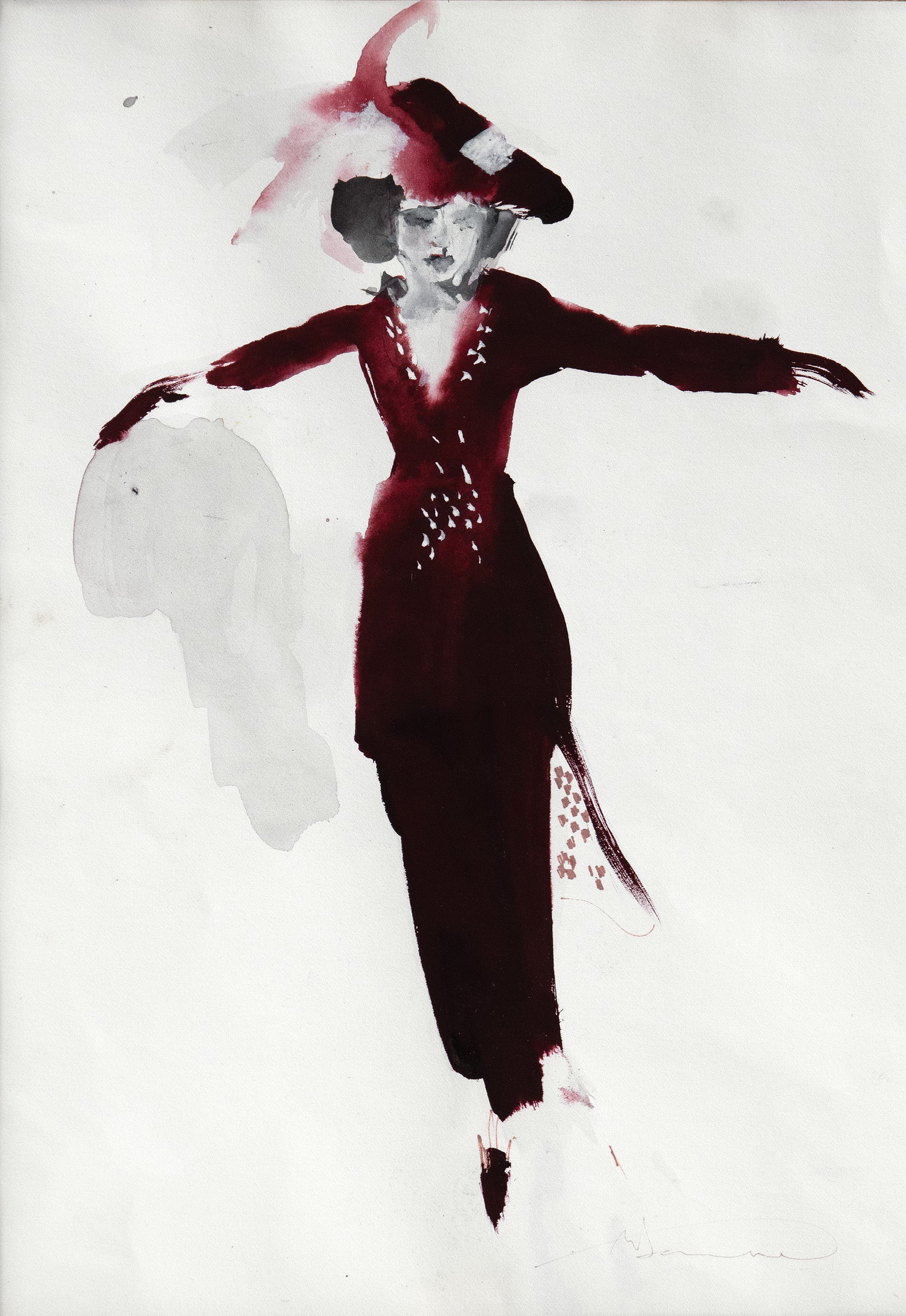Signed bottom right haute couture costume design in gouache, ink, pencil and charcoal on paper.