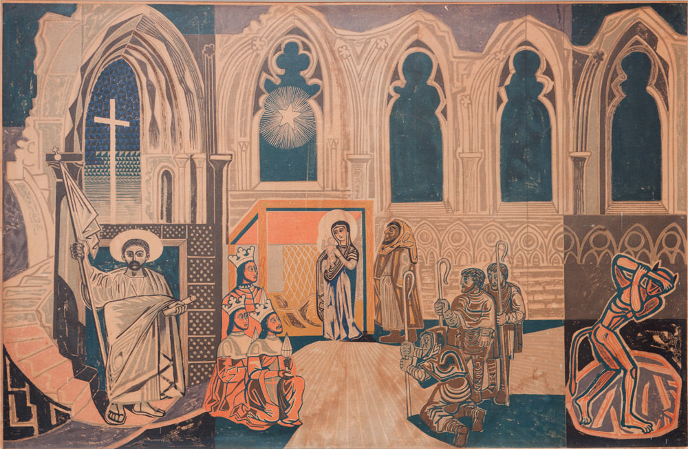 Very scarce Edward Bawden poster created for British Railways 60 years ago, depicting 3 of the York mystery plays. Aged and time stained but a wonderful evocation of an era.