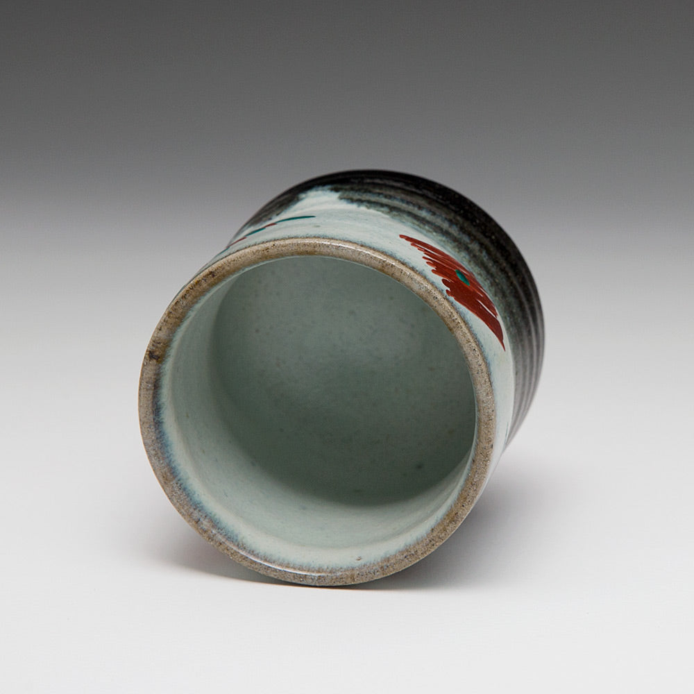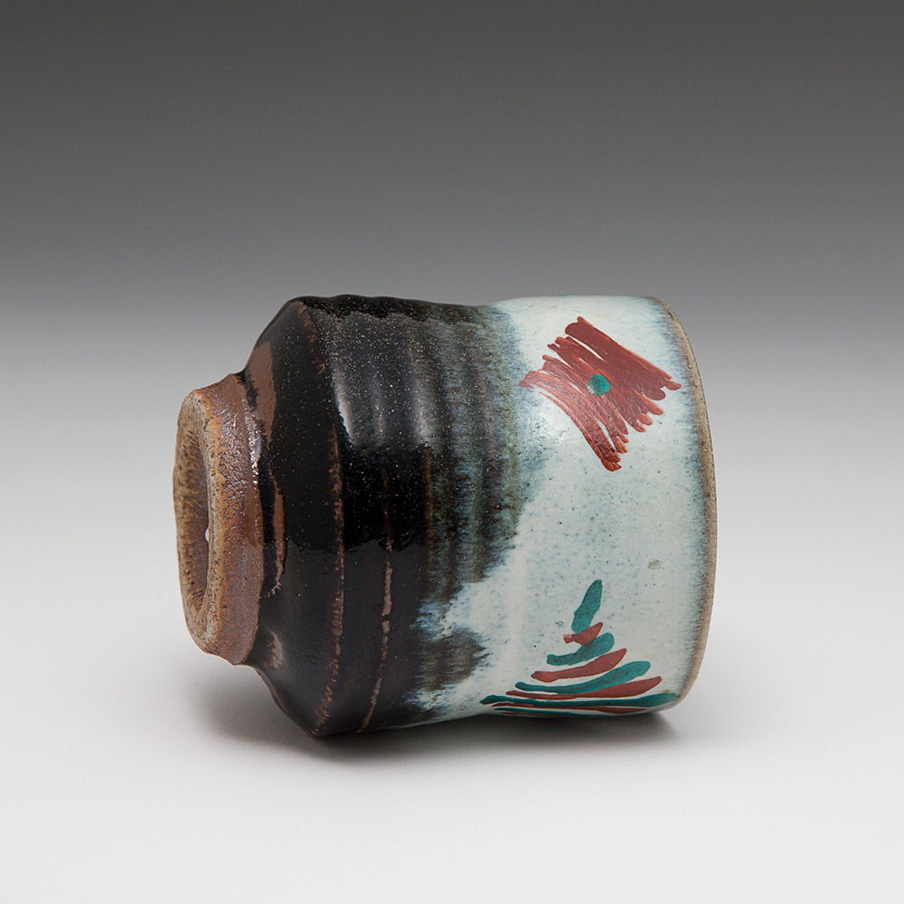 Unlike his elders, however, Tomoo has become much more daring in the use of unconventional shapes, extensive application of overglaze enamelled decorations, and surface textures. In particular, his tiered flasks are very progressive, and unlike anything seen before in a mingei genre. It is clear that Tomoo has been looking beyond the works of his forebears, examining works from the early English Arts and Crafts movement.
